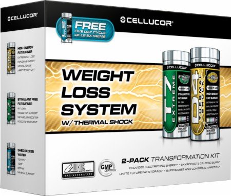 Cellucor - Weight Loss System with Thermal Shock - Free L2 Extreme Cellucor Weight Loss System with Thermal Shock Free L2 Extreme boasts a comprehensive approach to fat loss that guarantees results plus weight loss success. Cellucor's Weight Loss System is comprised of three products synergistically designed to achieve total fat loss: D4 Thermal Shock, T7 Extreme, plus L2 Extreme. D4 Thermal Shock is an ultra-concentrated, high energy fat burner that boosts metabolism plus energy levels without unwanted side effects or crash. T7 Extreme is a stimulant-free thermogenic that dramatically increases caloric burn without increasing heart rate or blood pressure. L2 Extreme is the fastest plus strongest diuretic on the market, containing vital electrolytes to replenish the body plus increase weight loss. D4 Thermal ShockD4 Thermal Shock's utilizes beta-2 signaling to induce a natural adrenaline rush that delivers unmatched energy plus focus while boosting metabolism plus endurance. Most weight loss products have complicated dosing instructionsusers are forced to constantly up the dose for the product to be effective: some ultimately require 8+ pills a day! D4 Thermal Shock is the most potent thermogenic available, boasting an ultra-concentrated formula that melts away body fat plus delivers extreme energy in a simple 1 pill dose. T7 Extreme Cellucor Chrome T7 Extreme Stimulant Free Fat Burner dramatically increases caloric burn without increasing heart rate or blood pressure. Not all fat burners are created equal. Traditionally weight loss aids have very simple formulasloads of caffeine to boost metabolism, plus little else to truly promote weight loss. Cellucor's T7 Extreme is a 100% stimulant free, safe, natural weight loss aid. Because it's caffeine free, T7 Extreme is the fat loss product for stimulant-sensitive individuals.
