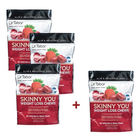 Skinny You Weight Loss ChewsTM-the newest addition to Dr. Tabor's Slim & Beautiful Diet® line-are delicious tasting treats that can triple your weight loss with the power of GreenSelect® Phytosome. In a recent multi-center clinical trial of over 100 male plus female participants, those taking GreenSelect Phytosome with a reduced-calorie diet (1,850 calories a day for men plus 1,350 calories a day for women) lost an average of 30 pounds in 90 days, while those on a reduced-calorie diet alone only lost 10 pounds. That's triple the weight loss from this extraordinary fat-burning extract! With just two Skinny You Weight Loss Chews, taken twice daily, you get the clinically-studied dose of GreenSelect Phytosome to safely fast forward you to your weight loss goals. But that's not all. This research dose of GreenSelect Phytosome was also shown to improve body mass index (BMI) for a healthier lean-to-fat body composition AND significantly reduce total cholesterol plus triglycerides in the same 90-day research period. GreenSelect Phytosome is a standardized, decaffeinated green tea extract created with an advanced phytosome encapsulation technology. This scientific process combines the health-promoting plus fat-burning nutrients in green tea (catechins plus EGCG) with phosphatidylcholine, a soy compound that makes the green tea extract more stable plus 3 times more absorbable than ordinary green tea extract. This unique phytosome form also helps to keep the green tea extract active in your bloodstream far longer, for greater fat-burning results. The mouth-watering berry flavor plus soft, satisfying texture of Skinny You Weight Loss Chews combine for something you've probably never experienced on any diet before...a delicious treat that conquers your sweet tooth plus helps you drop pounds fast