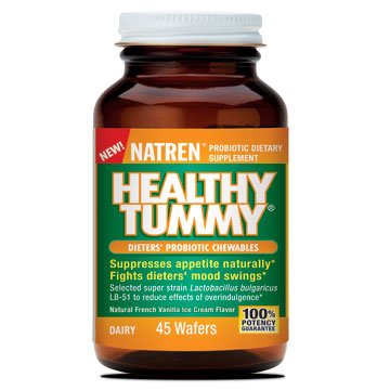 8-unit VALUE PACK of Healthy Tummy-Diet Probio, 45 ct - The dieters' probiotic chewable wafer.Healthy Tummy probiotic chewable wafers provide 1 billion colony forming units (cfu) of effective beneficial bacteria Lactobacillus bulgaricus super strain, LB-51 per one-wafer serving to aid the digestion process plus weight management. This fabulous digestive aide prolongs the feeling of fullness by slowing digestion plus helps counteract the rapid swings in glycemic index produced when quantities of empty calories are consumed. This prevents the rapid fluctuation in glucose levels plus stops the sugar blues that trigger another eating cycle. If glucose levels are higher than the body's requirements, fats are produced plus stored as excess body weight.The special microbial metabolites produced by Lactobacillus bulgaricus LB-51 during the technologically advanced plus unique fermentation process include peptides plus amino acids. The release of multiple satiety (fullness) peptides work together to suppress appetite, end hunger pangs naturally plus tell you that you've had enough to eat. During the fermentation process, Lactobacillus bulgaricus LB-51 also releases essential amino acids, including tryptophan, an important link in the production of serotonin which regulates mood, appetite plus sleep functions.Healthy Tummy works to help control your appetite: Low calorie only 5 calories per wafer. Ingredient beet fructose has a low glycemic index (GI) of 20 for significant health benefits for weight management. Helps stabilize moods. Delicious, natural French vanilla ice cream flavor. Helps quell hunger pangs when used as a diet snack. Satisfies the craving for something sweet. Helps curb appetite. Does not contain any harmful ingredients found in other diet products, such as chemicals, artificial sugars, caffeine, ephedrine, PPA (phenylpropanolamine), phenylalanine. Potency guaranteed through the printed expiration date. Researched, formulated plus manufactured only by Natren.